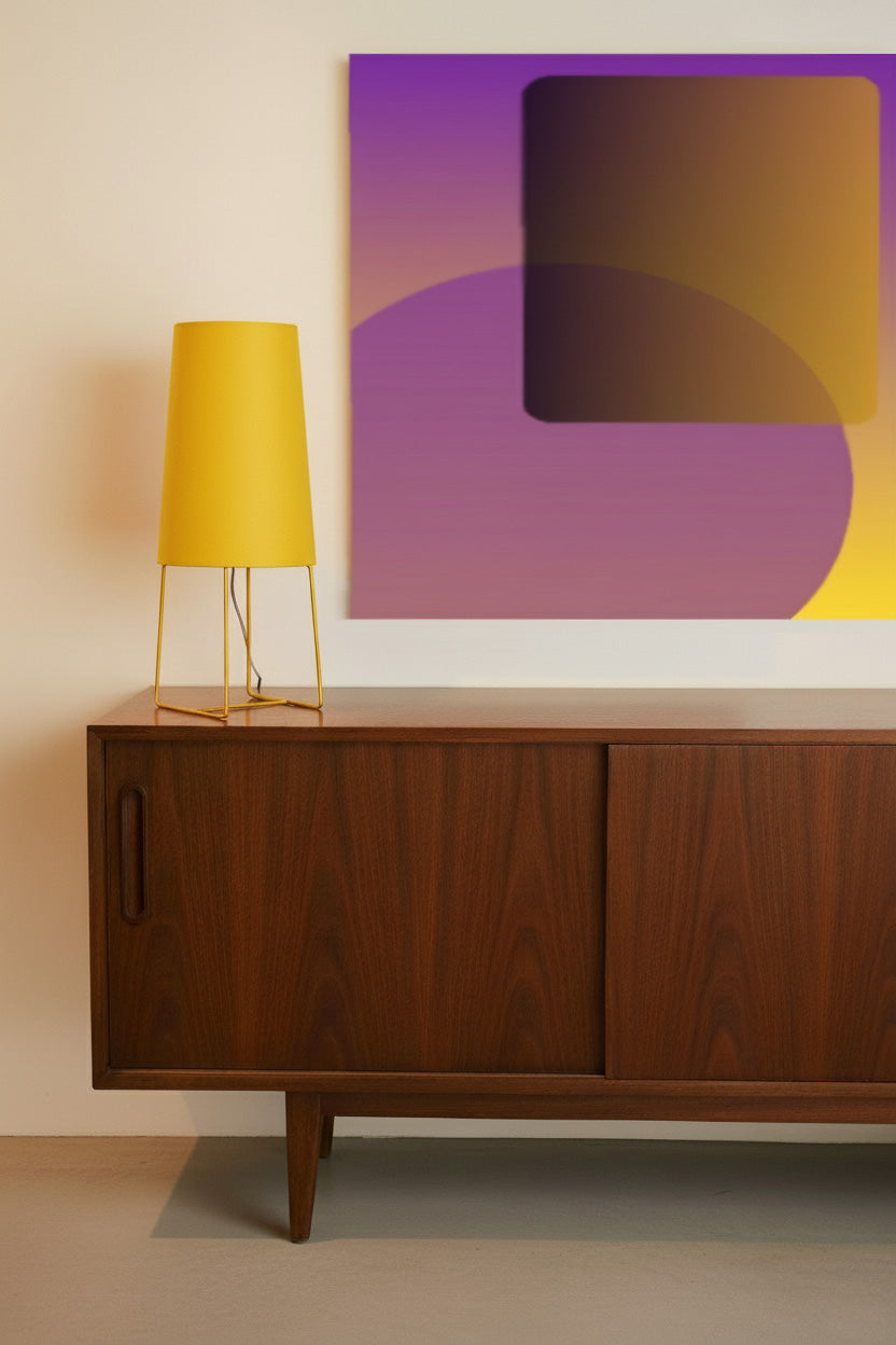Een gele design tafellamp is een opvallend interieur item dat niet onopgemerkt blijft.